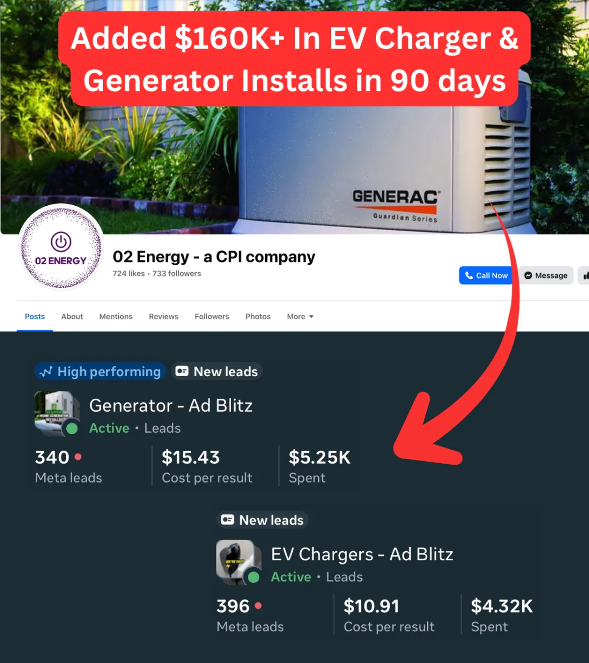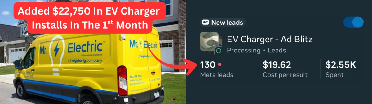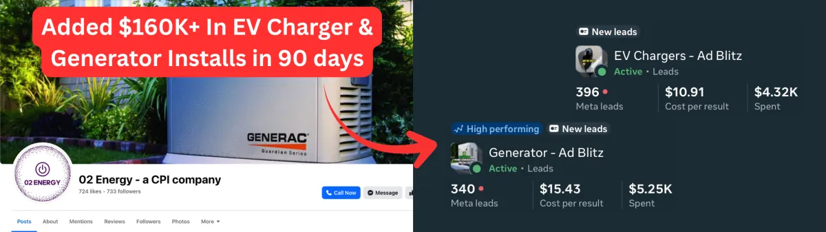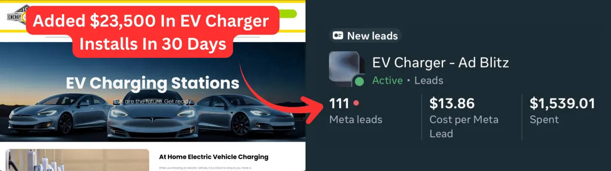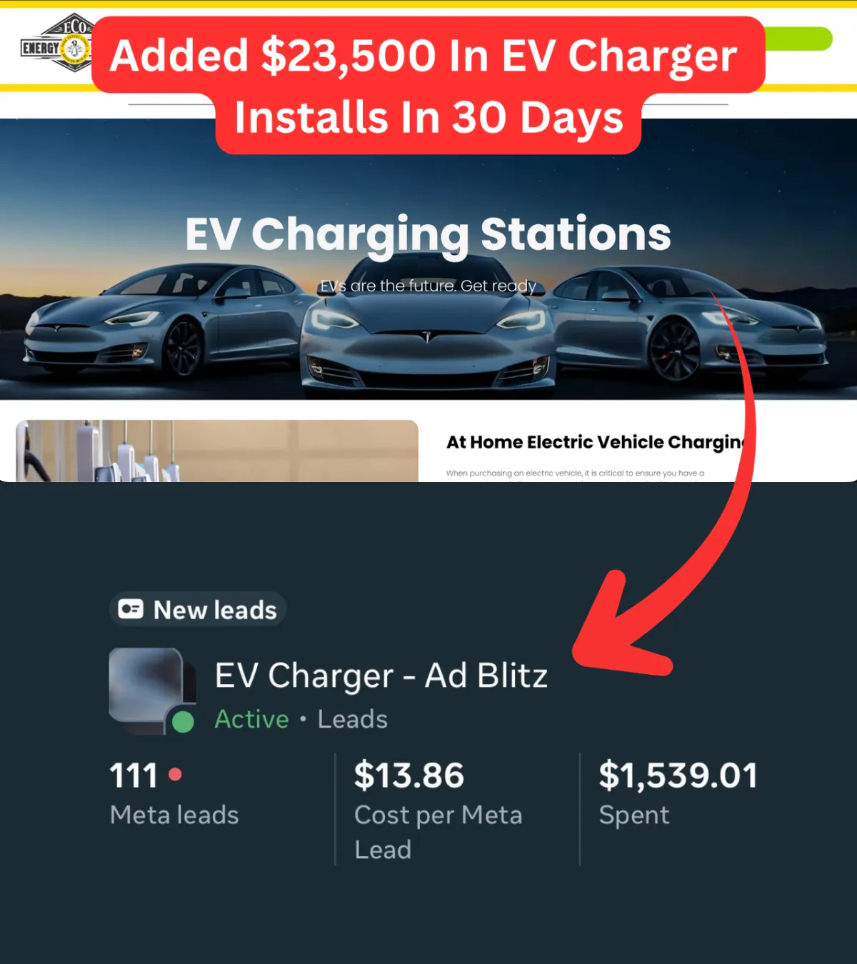 We run battle-tested ads that have already generated thousands of installs for services like EV chargers, backup generators, panel upgrades, and solar with battery storage.